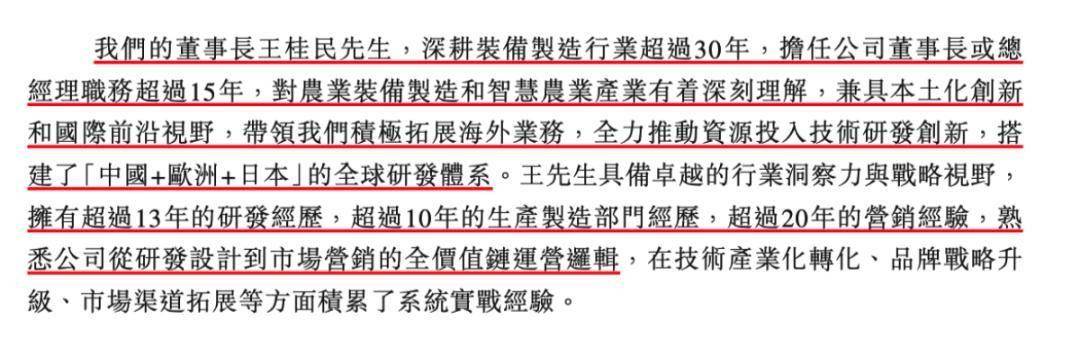 按照公司披露,高级办理团队平均行业从业年限跨越15年,正在农业配备研发和市场开辟方面堆集了极为丰硕的经验,此中董事长王桂平易近深耕配备制制行业跨越30年,担任公司董事长或总司理职务跨越15年。